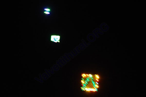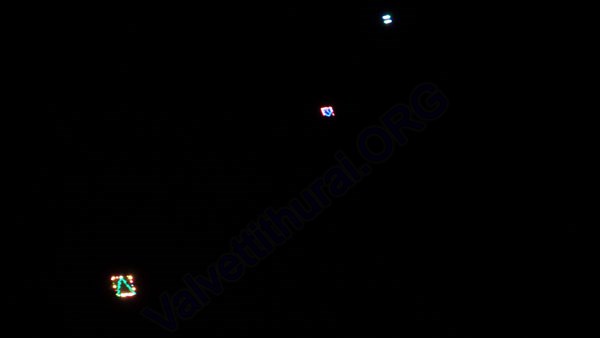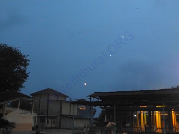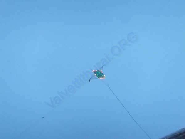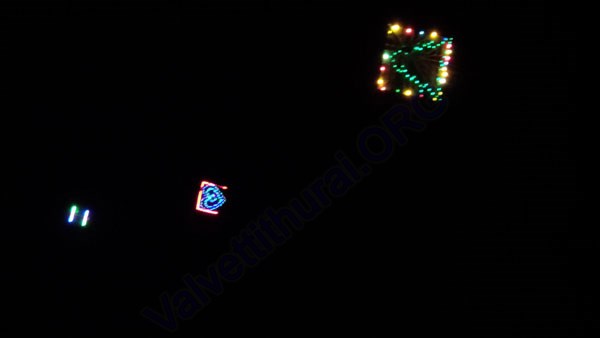 Three numbers of Kites, decorated with numerous lights are flying in series, i.e one after the other, at Thiruvil, Valvettithurai. Kites which are in 8, 6 and 4 foot high in size, about 125 meter apart from each other, have been fixed with more than 1000 numbers of of various types of bulbs, including LCD bulbs.