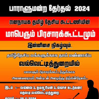 ஜனநாயக தமிழ் தேசிய கூடடணியின் பாராளுமன்றத் தேர்தல் 2024 இன் மாபெரும் பிரச்சாரக் கூடடமும் இன்னிசை நிகழ்வும் 09-11-2024 ஆம் திகதி பிற்பகல் 5 மணிக்கு வாழ்வை உதயசூரியன் உல்லாசக் கடற்கரையில் நடைபெறவுள்ளது