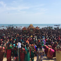 Valvettithurai Sri Muththumariyamman temple holy bath (‘Theertham’ in Tamil) festival held today morning at Orani beach, Valvettithurai.  The goddess had reached her destination for the holy bath at about 0930 hours and holy bath continued till about 1030 hours. Followed by special Pooja at Orani, the Goddess has returned to Nediyakadu Pillaiyar temple, from where the Goddess is expected to return to the Amman temple today late night.
